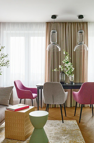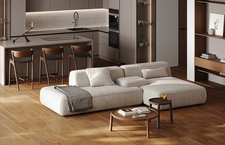 Единое полотно пола создаёт общее пространство, которое плавно перетекает из одной зоны в другую.