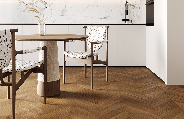 Плашки на торцах обрезаны под углом 45°, чтобы при укладке соединиться в чёткий V-образный рисунок. Геометрия укладки «шевроном» создаёт атмосферу порядка и гармонии, а торжественный ритм рисунка напоминает о величии залов Версальского дворца.