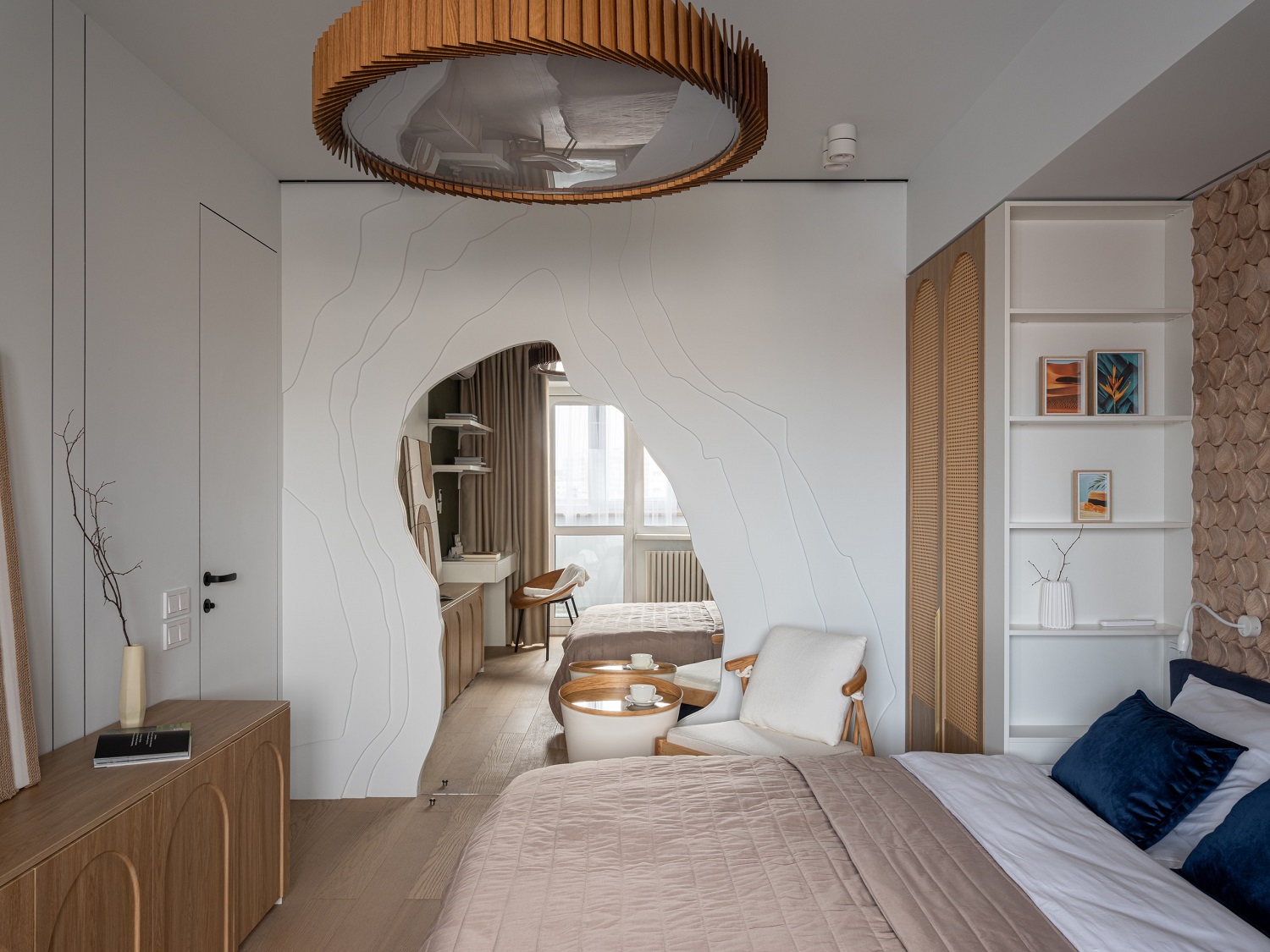 Спальня с дырой неправильной формы в стене — это необычный проект дизайнера интерьеров Натальи Корнюхиной. Сочетание синего тона глубоких вод и тёмно-зеленого создали в этой спальне особую атмосферу близости к природе.