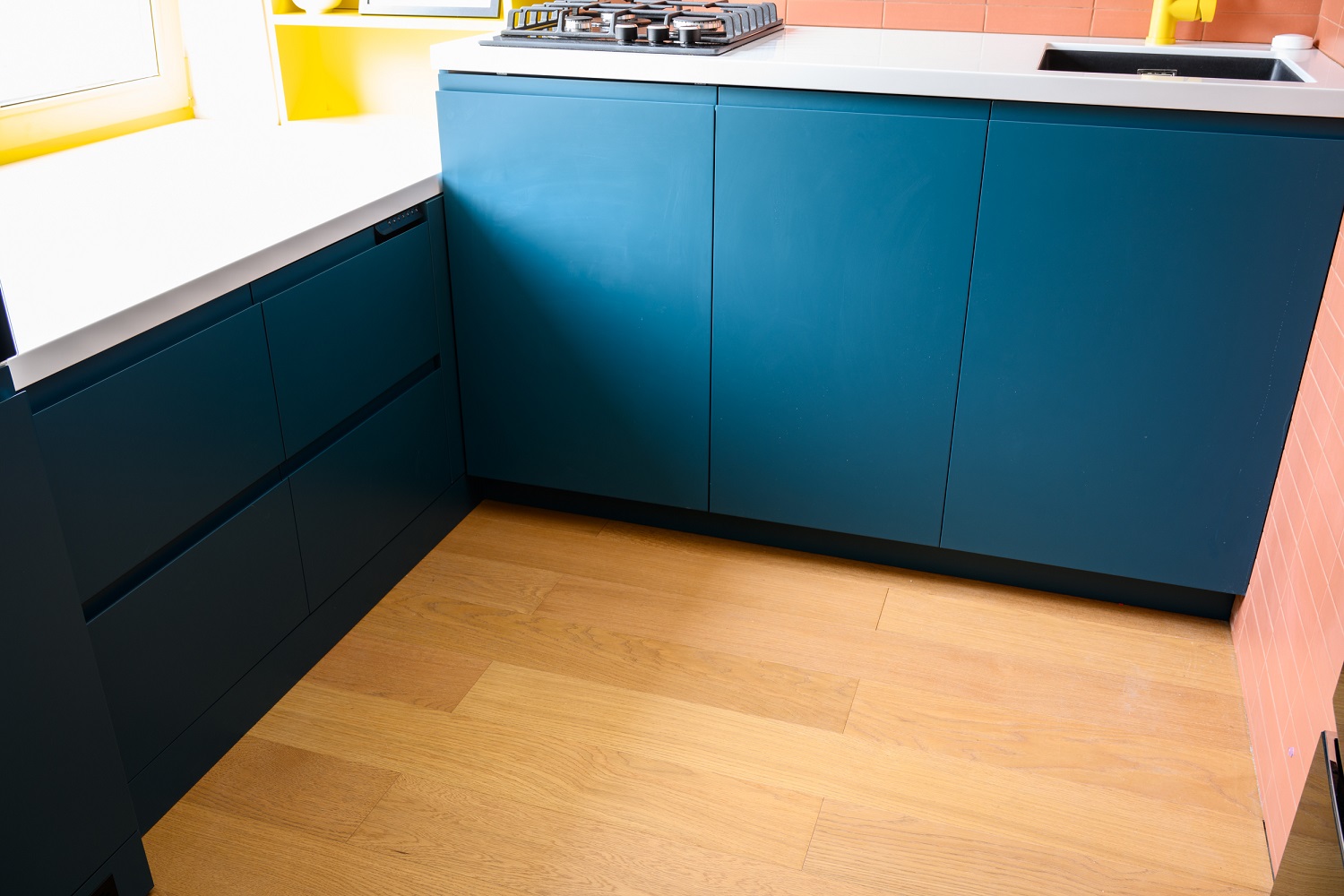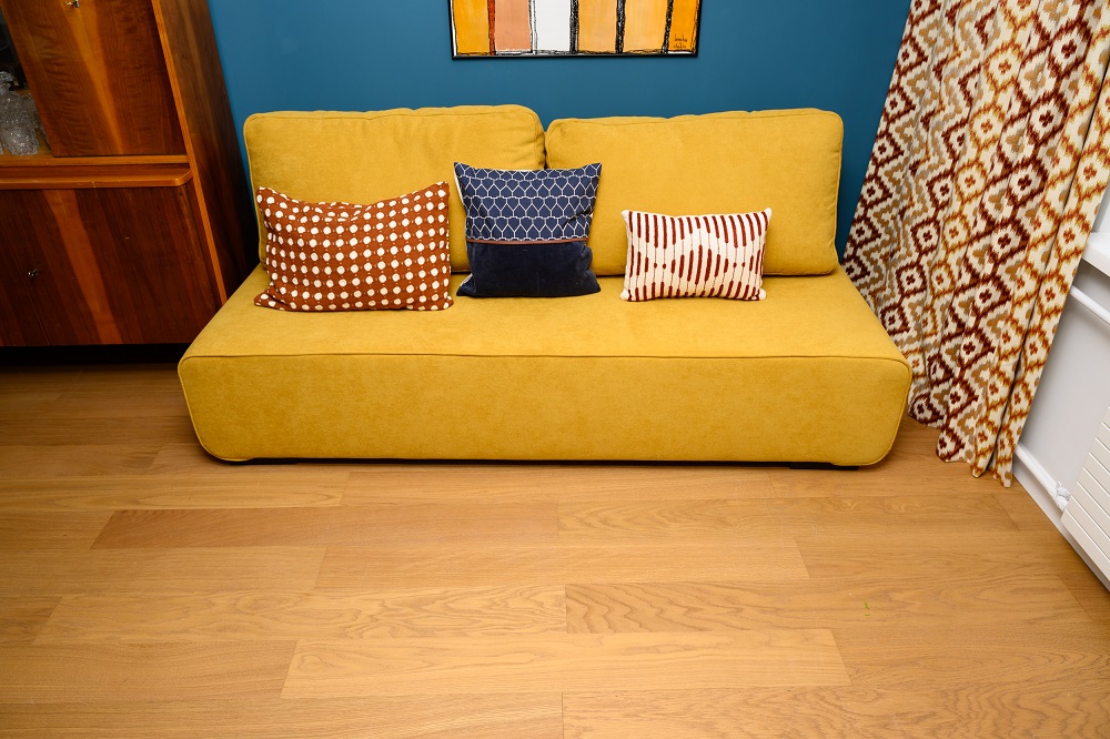 Кухня-гостиная в стиле шестидесятых предполагает полы из натурального дерева, но в новом прочтении: кварцпаркет Quartz Parquet Классик Дуб Медовый Раф 463 не боится ни воды, ни когтей домашних питомцев.